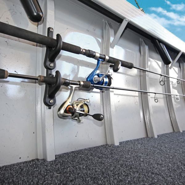 Este portacañas sostiene dos cañas de pescar en las paredes del